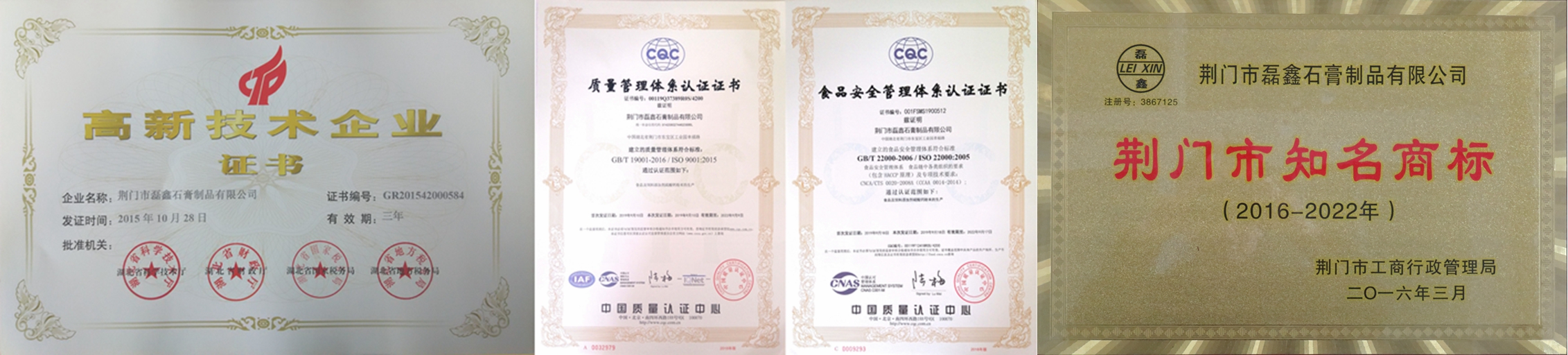 國家高新技術企業(yè)!湖北省專精特新中小企業(yè)!湖北省支柱產業(yè)細分領域隱形冠軍培育企業(yè)!湖北省守合同重信用企業(yè)!湖北省兩化融合示范企業(yè)!荊門市知名商標!中國高純、高白、高亮、超細硫酸鈣(石膏)生產基地!中國取得《食品生產許可證》的食品添加劑硫酸鈣(石膏)供應商!中國取得《飼料添加劑生產許可證》和《產品批準文號》硫酸鈣供應商!中國取得《出口飼料生產、加工、存放企業(yè)檢驗檢疫注冊登記證》飼料添加劑硫酸鈣供應商!通過ISO9001國際質量管理體系認證!通過ISO22000國際食品安全管理體系認證!通過HALAL國際清真認證!通過KOSHER猶太認證! 荊門市磊鑫石膏制品有限公司成立于2002年,位于石膏資源富集的湖北省荊門市東寶區(qū)工業(yè)園幸福路,占地27000余平方米,是一家在業(yè)內享有盛譽的集石膏、石膏粉和硫酸鈣制品研發(fā)、生產、銷售于一體的高新技術企業(yè)。公司擁有 “磊鑫”、“杰普生”、“凱氏蘇特”等5個國家注冊商標,2個發(fā)明專利,18個實用新型專利,50余篇自有技術應用研究,36篇權威期刊發(fā)表技術論文。主要產品有:醫(yī)藥級硫酸鈣、食品級硫酸鈣、飼料添加劑硫酸鈣、人造石透明填充粉,凱色粉、涂料及化妝品功能性填料和特級半水纖膏粉、混合石膏粉、模型石膏粉,建筑石膏粉等九大系列50余種產品。公司享有自營進出口權,客戶遍布全世界,是多家公司、集團和世界500強企業(yè)的優(yōu)秀供應商!產品遠銷到韓國、日本、俄羅斯、中國臺灣、東南亞、歐美、中東、非洲等國家和地區(qū)。公司緊靠207國道,焦柳鐵路穿境而過,距漢江碼頭50公里,長江沙市港90公里。交通運輸便利,確保及時供貨。“待用戶為上帝誠信為本,視質量為生命持之以恒!”是我們的企業(yè)宗旨,與我們合作是您明智的選擇,共謀發(fā)展是我們共同的目標!歡迎垂詢,歡迎惠顧! Your Trusted Source For Food-Grade Calcium Sulfate!——做全球更好的食品級硫酸鈣(石膏)供應商! ——CGC·磊鑫石膏